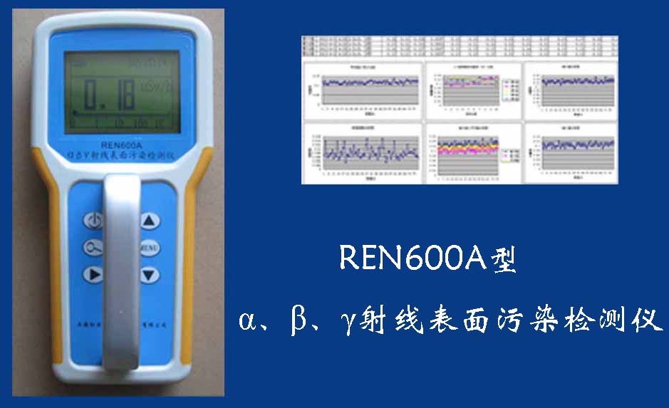REN600A 表面沾污檢測儀REN600A型α、β、γ射線表面污染檢測儀即可檢測α、β、γ射線,也能檢測到X射線,它采用高速嵌入式微處器作為數據處理單元,點陣式大屏幕LCD液晶顯示,讀數清晰、操作方便,具有400條超大容量數據存儲。儀器采用進口的大面積MICA蓋革探測器,具有較高探測效率,可進行α、β輻射表面污染檢測和X、γ輻射劑量率的監測。此外通過配套的RenriCont表面污染管理軟件可將存儲的數據讀出后分析?蓮V泛用在制藥廠、實驗室、發電廠、進出口商檢、采石場、環境實驗室、環境污染調查、核安全應急、緊急狀況營救站、金屬處理廠、地下油田、供油管道裝備、醫院核醫學科、同位素實驗室、環境保護和警察局等部門。REN600A型α、β、γ射線表面